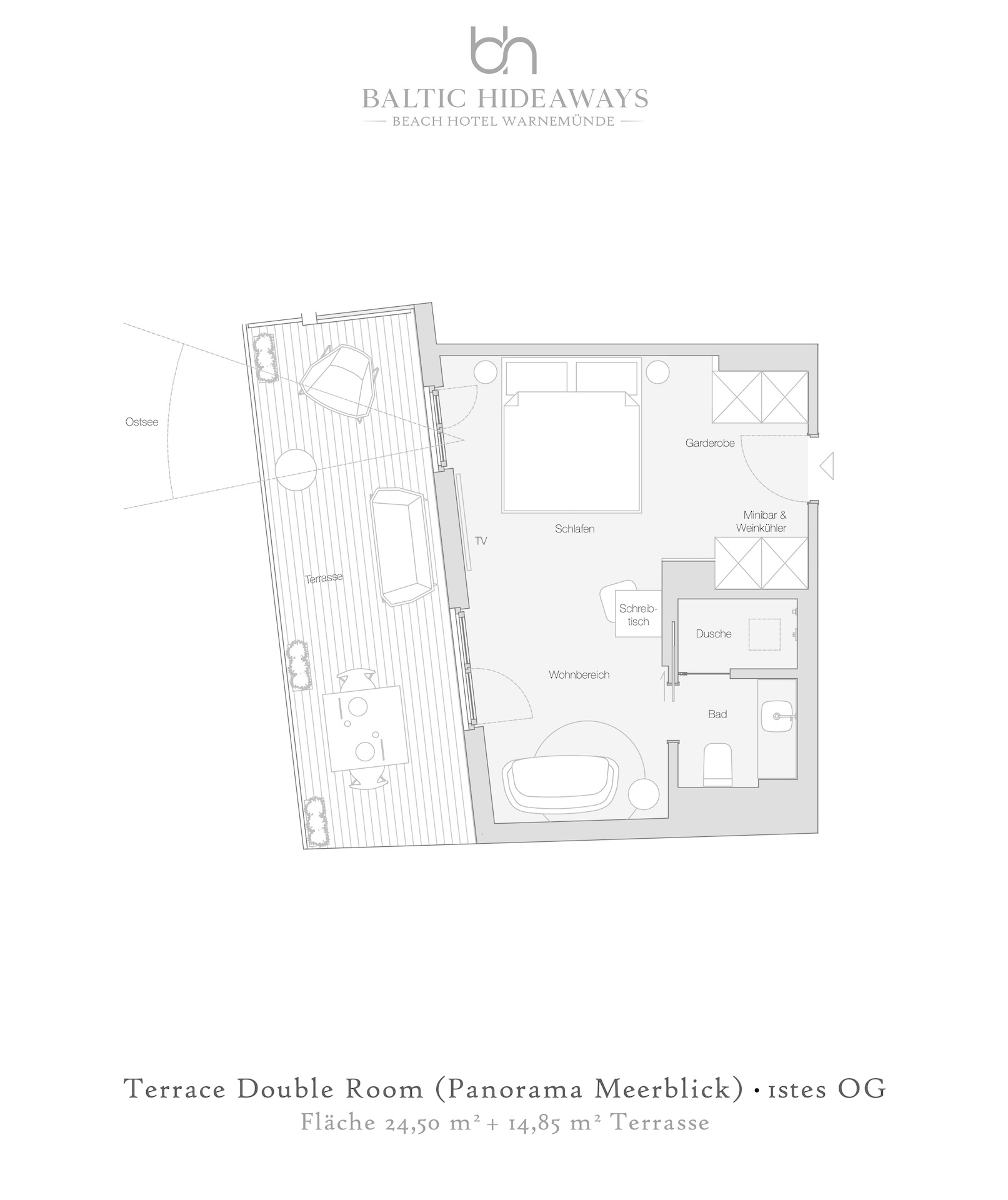 Der Terrace Double Room liegt im 1. OG mit unmittelbarer Ausrichtung zum Strand. Die Suite verfügt über einen perfekten 180 Grad-Meerblick. Strand und Leuchtturm sind immer im Blick. Ein großer, aus der Decke klappbarer TV-Screen ermöglicht ein Kinoerlebnis selbst dem Bett. Der Außenbereich ist das Highlight der Suite. Er umfasst über eine gemütliche Sitzecke für Sie uns Ihre Freunde. Der perfekte Ort, um einen Sommerabend mit Freunden über der Strandpromenade ausklingen zu lassen.