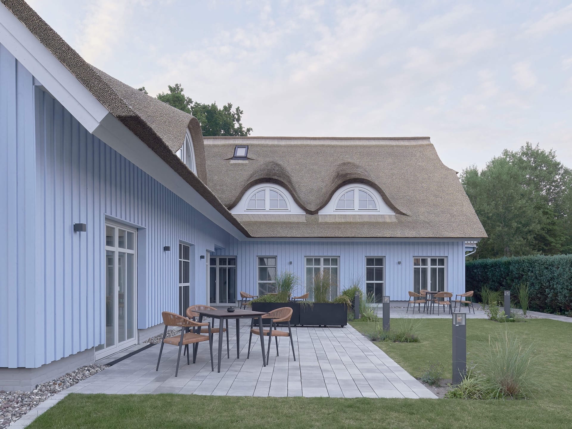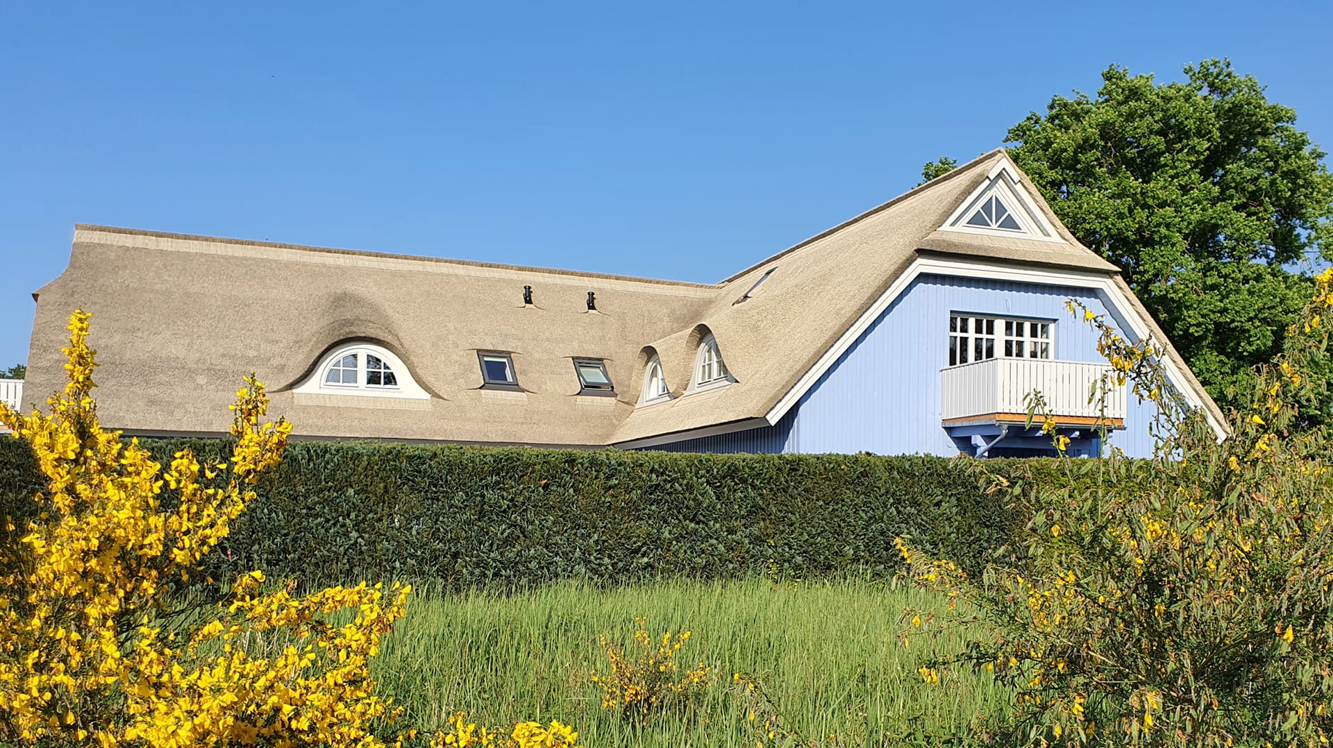 Reettraum Prerow ist ein frisch saniertes Ferienhaus im ortstypischen Darßer Stil. Das Haus ist durch die blaue Holzfassade, die typischen Darßer Türen sowie die Fledermausgauben und das Reetdach charakterisiert. Hinter dem Haus liegt eine große Sonnenterrasse.