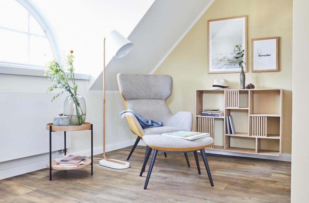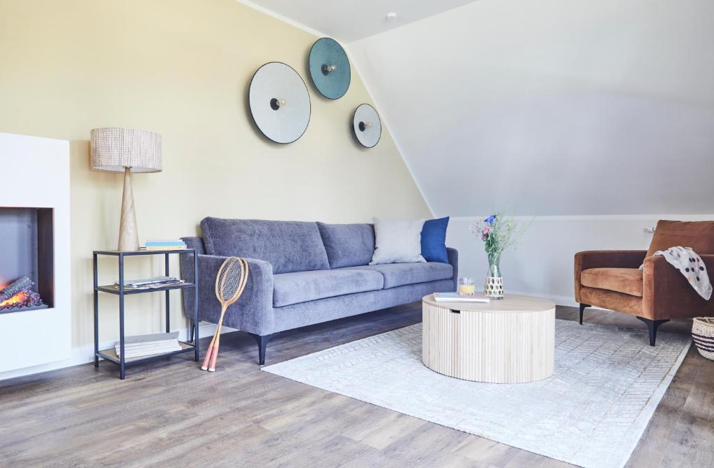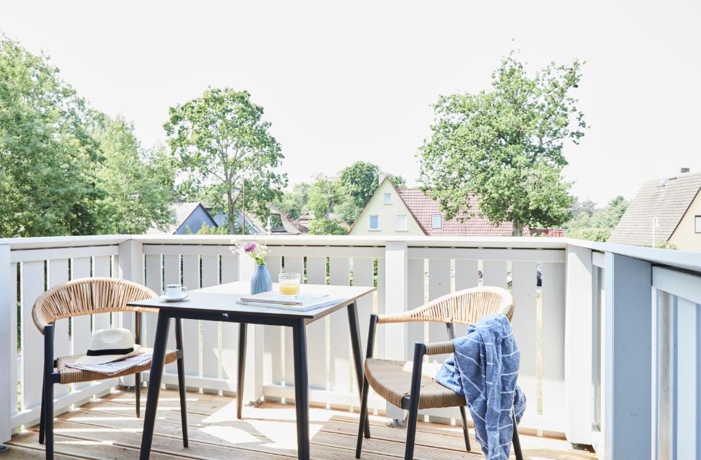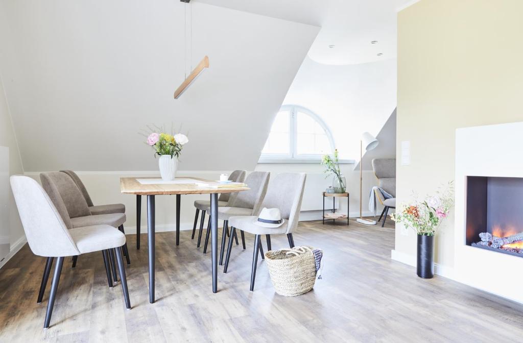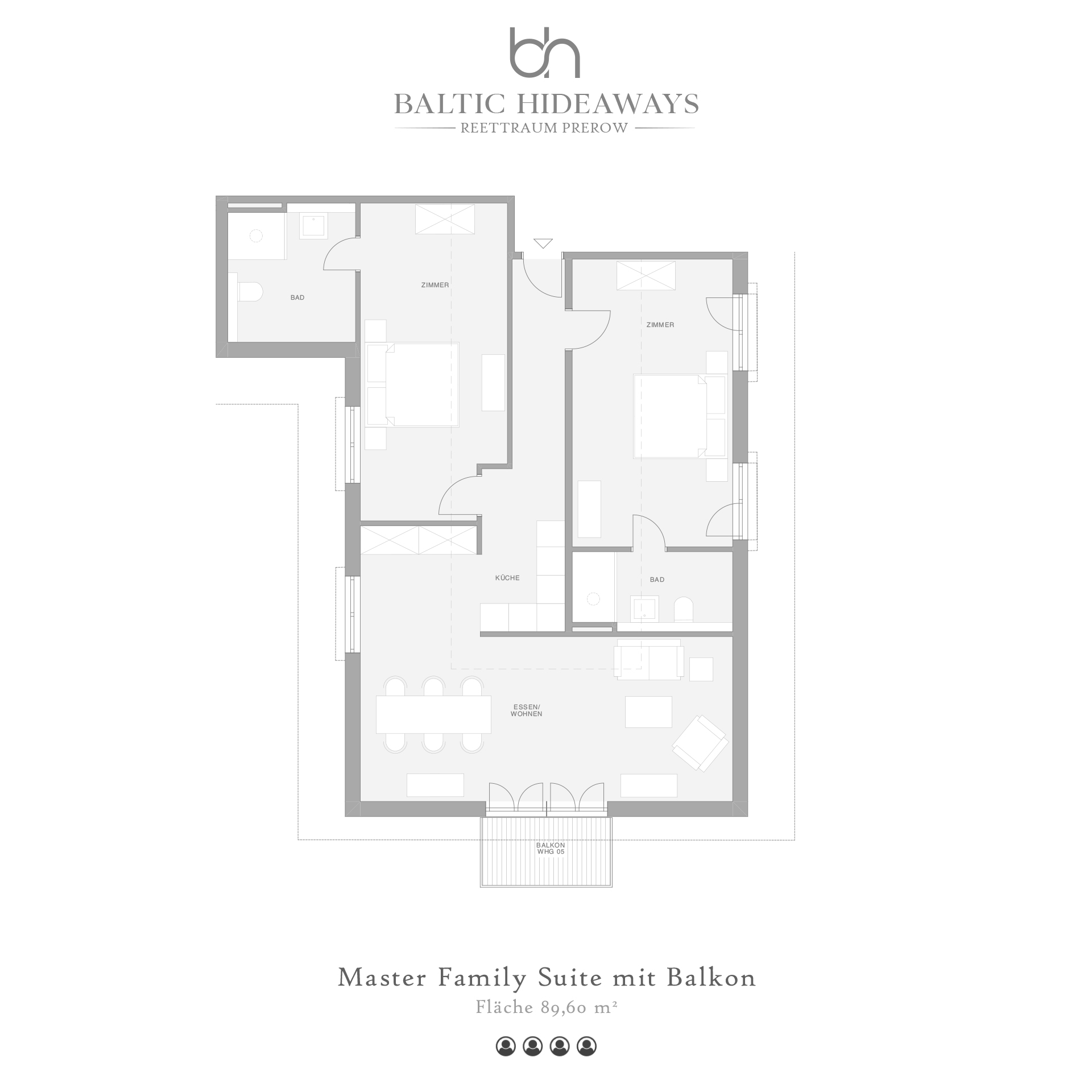 Die Master Family Suite mit Balkon befindet sich im 1. OG und verfügt über 89,6 m² Wohnfläche. Damit ist die Wohnung die größte und wahrscheinlich schönste Wohnung des Hauses. Die Wohnung verfügt über einen Wohn- und Ess-Bereich und zwei Schlafzimmer. Die Schafzimmer sind sehr geräumig und umfassen jeweils ein großzügiges En-Suite-Bad mit Regendusche. Durch die Fledermaus-Gauben und die Blickbeziehung zum Reet sind die Schlafzimmer besonders gemütlich. Die Küche ist über eine Eck-Situation in den Wohnbereich integriert und bietet viel Platz für entspanntes Beisammensein. Der von der Hafenstraße abgewandte Balkon lädt auf ein Frühstück oder ein Sonnenbad ein.