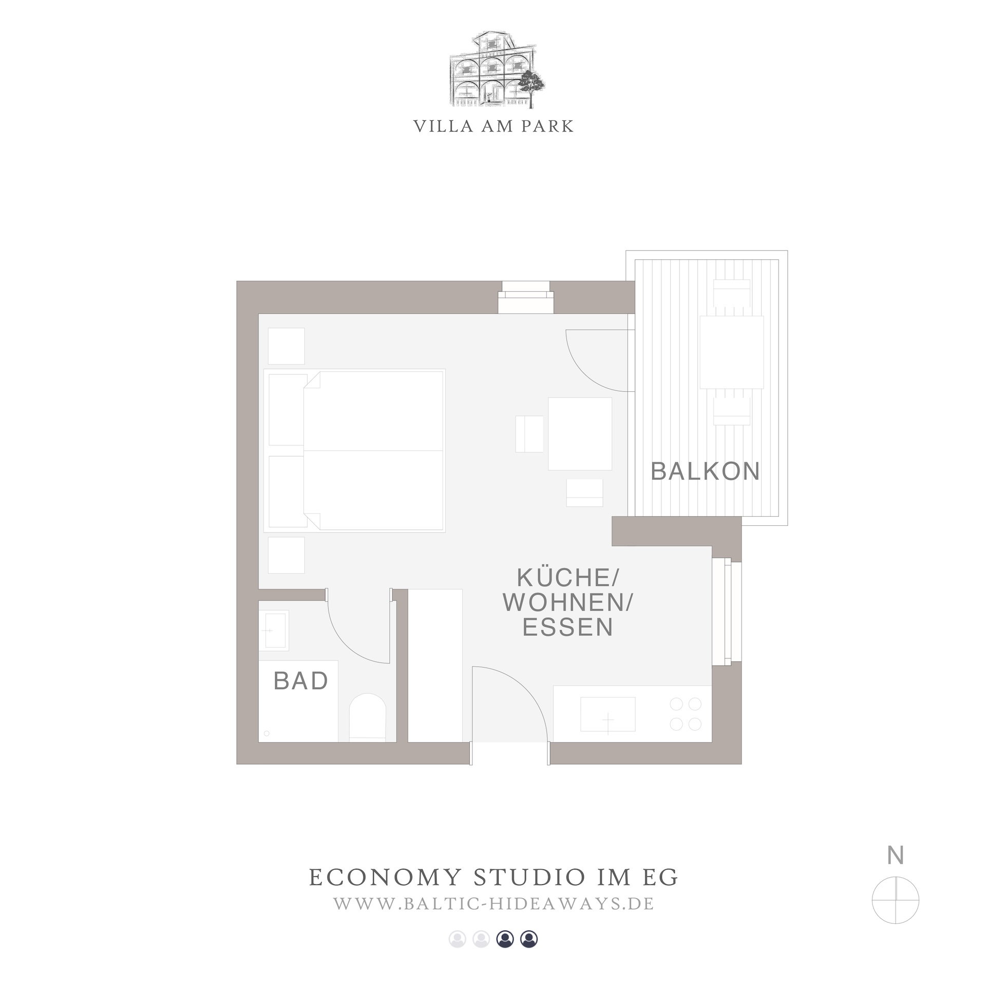 Das Economy Studio mit Balkon befindet sich im Erdgeschoss und verfügt über geräumige ca. 27 m², über einen kombinierten Schlaf-/Wohnraum der zum Wohlfühlen einlädt, eine offene Küchenzeile und ein Badezimmer mit Dusche. Der Balkon ist seitlich zum Kurpark gelegen. Die Küchenzeile ist ausgestattet mit einem Kühlschrank, Toaster und Ceran-Herdplatte, diese verfügt aber auch über Geschirr, Kochutensilien und Besteck. Für den morgendlichen Kaffee und Tee ist auf jeden Fall gesorgt, Sie können sich dieses mit der vorhandenen Kaffeefiltermaschine oder Nespresso Kaffeemaschine und dem Wasserkocher zubereiten. Der gemütliche Schlaf-/Wohnraum ist mit einem großen Flachbildfernseher mit Kabel-TV-Empfang und einem Radio ausgestattet, das WLAN steht Ihnen kostenlos zur Verfügung. Zu Ihrer Wohnung gehört auch ein Balkon, dieser mit Balkonmöbel ausgestattet ist, wo Sie den Tag genießen können, aber auch Abends ungestört den Tag ausklingen lassen können.