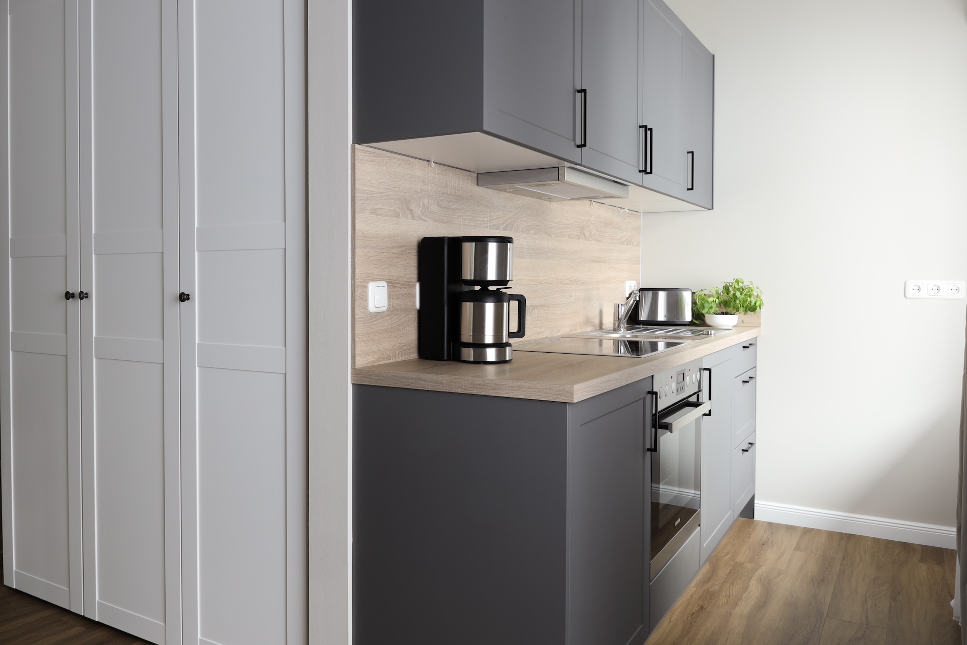 Das Studio mit Balkon befindet sich im Dachgeschoss und verfügt über geräumige ca. 35 m², über einen kombinierten Schlaf-/Wohnraum der zum Wohlfühlen einlädt hinzu kommt eine ausgestattete offene Küchenzeile und ein Badezimmer mit Dusche. Die Küchenzeile verfügt über einen Kühlschrank, Toaster, Backofen und Ceran-Herdplatte sowie verfügt diese auch über Geschirr, Kochutensilien und Besteck. Für den morgendlichen Kaffee und Tee ist auf jeden Fall gesorgt, Sie können sich dieses mit der vorhandenen Filterkaffeemaschine sowie eine Nespresso Kaffeemaschine und dem Wasserkocher zubereiten. Der gemütliche Schlaf /- Wohnraum ist mit einem großen Flachbildfernseher mit Kabel-TV-Empfang und einem Radio ausgestattet, das WLAN steht Ihnen kostenlos zur Verfügung. Zu Ihrer Wohnung gehört auch ein Balkon, dieser mit Balkonmöbel ausgestattet ist, wo Sie den Tag genießen können, aber auch Abends ungestört den Tag ausklingen lassen können.