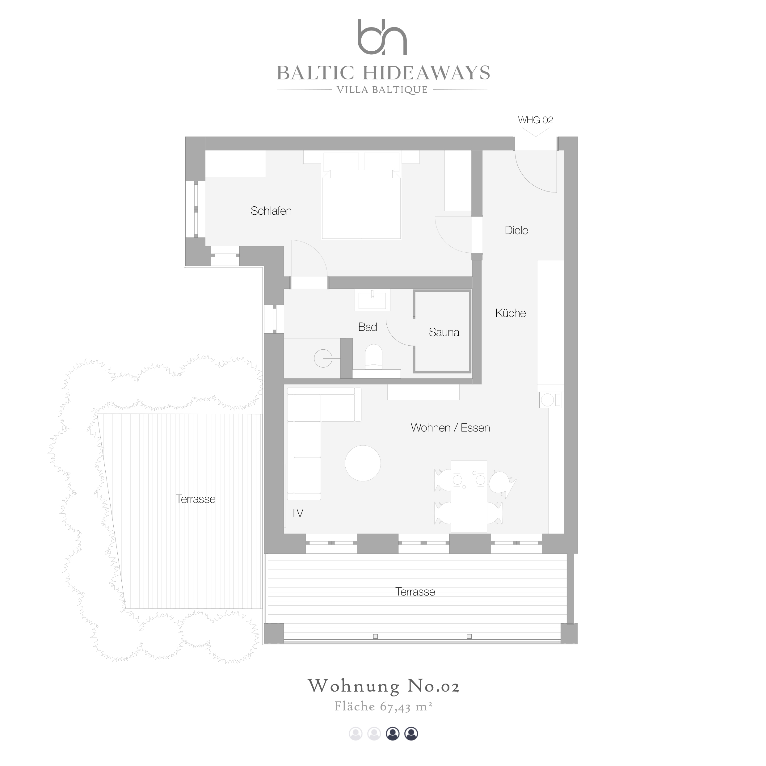Die Premium Wellness Suite mit eigener Loggia, Terrasse, Sauna und Kamin befindet sich im Erdgeschoss und verfügt über geräumige ca. 67 m², über einen separaten Schlaf-/Wohnraum, eine offene Küchenzeile und ein Badezimmer mit Dusche sowie einer Sauna. Die Terasse ist seitlich gelegen. Der gemütliche Wohnraum ist mit einem großen Flachbildfernseher mit Kabel-TV-Empfang ausgestattet und bietet einen Echtholzkamin für gemütliche Momente. Die Küchenzeile ist ausgestattet mit einem Kühlschrank, Toaster und Ceran-Herdplatte, diese verfügt aber auch über Geschirr, Kochutensilien und Besteck. Für den morgendlichen Kaffee und Tee ist auf jeden Fall gesorgt, Sie können sich dieses mit der vorhandenen Kaffeefiltermaschine und dem Wasserkocher zubereiten. Der gemütliche Wohnraum ist mit einem großen Flachbildfernseher mit Kabel-TV-Empfang ausgestattet, das WLAN steht Ihnen kostenlos zur Verfügung. Zu Ihrer Wohnung gehört auch eine Terasse, diese ist mit Terassenmöbel ausgestattet, wo Sie die Sonnenstunden genießen, aber auch Abends ungestört den Tag ausklingen lassen können.