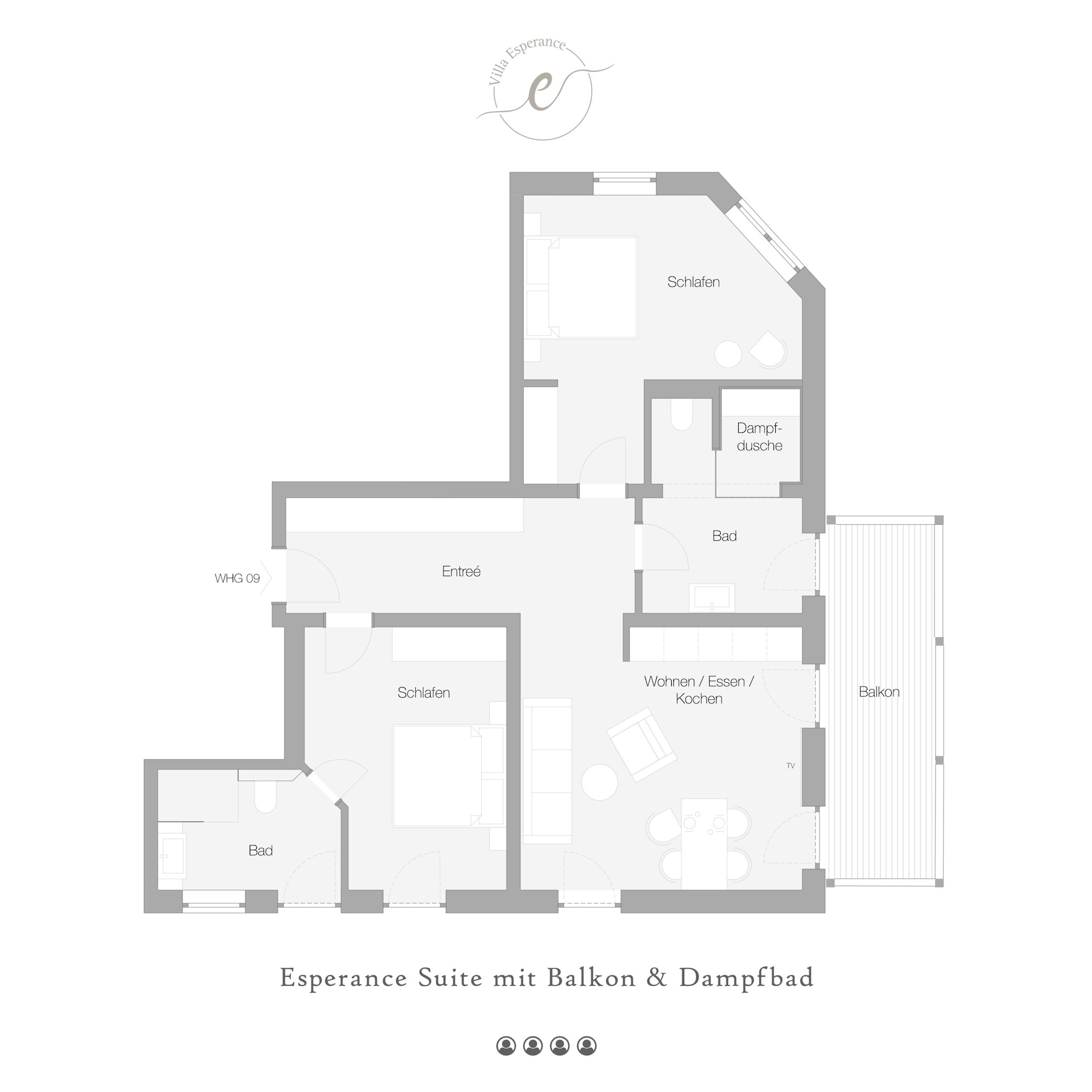 Die Esperance Suite mit Balkon und Dampfbad befindet sich in der 2. Etage und verfügt über geräumige ca. 83 m², über 2 Schlafzimmer und einen separaten Wohnraum, einer offenen Küchenzeile sowie 2 Badezimmer und 1 Dampfbad. Die Küchenzeile ist ausgestattet mit einem Kühlschrank, Toaster und Ceran-Herdplatte, diese verfügt aber auch über Geschirr, Kochutensilien und Besteck. Für den morgendlichen Kaffee und Tee ist auf jeden Fall gesorgt, Sie können sich diese mit der vorhandenen Kaffeefiltermaschine und dem Wasserkocher zubereiten. Der gemütliche Wohnraum ist mit einem großen Flachbildfernseher mit Kabel-TV-Empfang ausgestattet, das WLAN steht Ihnen kostenlos zur Verfügung. Zu Ihrer Wohnung gehört auch ein Balkon, dieser ist mit Balkonmöbeln ausgestattet ist, wo Sie den Tag genießen können, aber auch abends ungestört den Tag ausklingen lassen können.