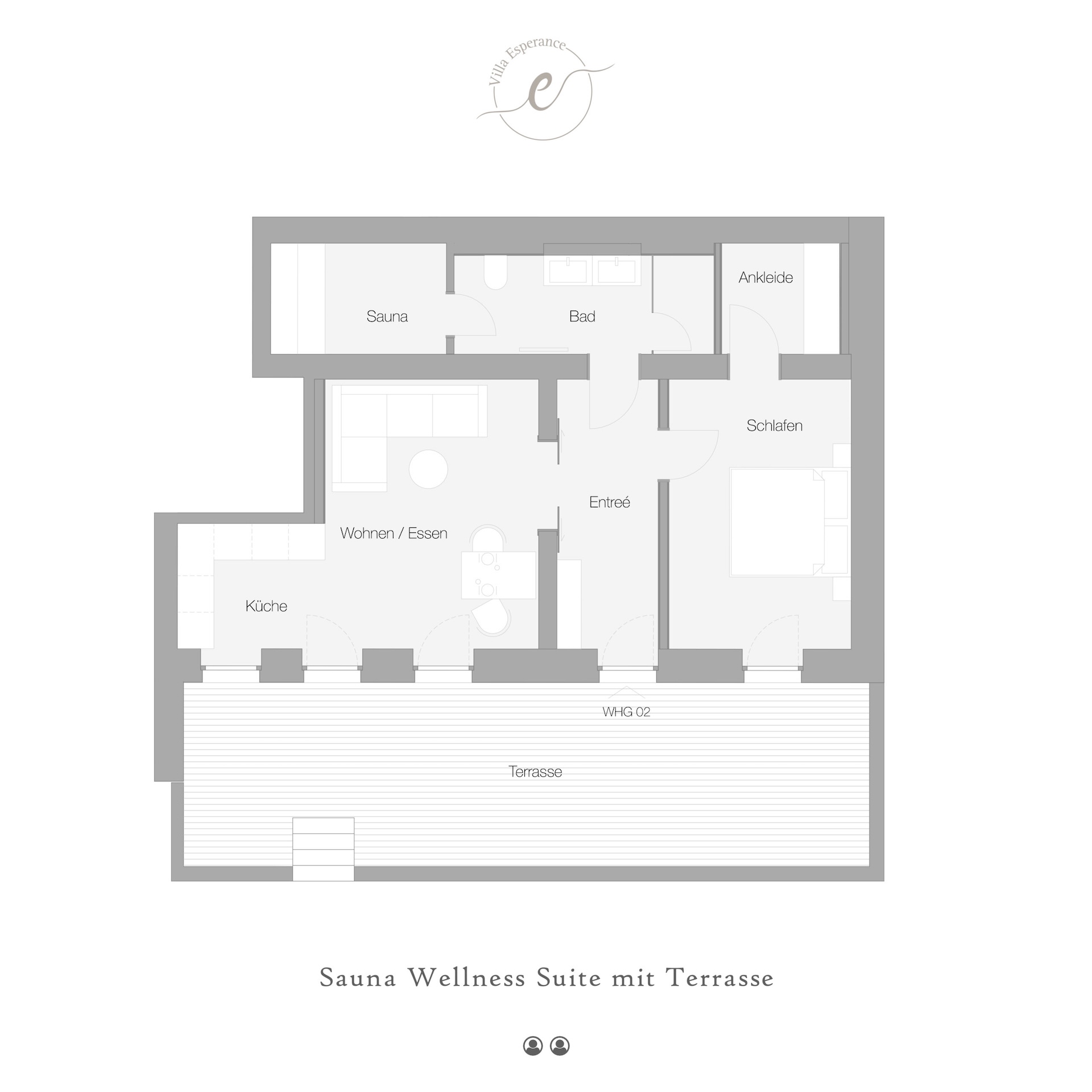 Die Sauna Wellness Suite mit Terrasse befindet sich im Erdgeschoss und verfügt über geräumige ca. 72 m², über einen separaten Schlaf-/Wohnraum, eine offene Küchenzeile und ein Badezimmer mit Dusche sowie einer Sauna. Die Terrasse ist seitlich gelegen. Die Küchenzeile ist ausgestattet mit einem Kühlschrank, Toaster und Ceran-Herdplatte, diese verfügt aber auch über Geschirr, Kochutensilien und Besteck. Für den morgendlichen Kaffee und Tee ist auf jeden Fall gesorgt, Sie können sich diese mit der vorhandenen Kaffeefiltermaschine und dem Wasserkocher zubereiten. Der gemütliche Wohnraum ist mit einem großen Flachbildfernseher mit Kabel-TV-Empfang ausgestattet, das WLAN steht Ihnen kostenlos zur Verfügung. Zu Ihrer Wohnung gehört auch eine Terrasse, diese ist mit Balkonmöbeln ausgestattet ist, wo Sie den Tag genießen können, aber auch abends ungestört den Tag ausklingen lassen können.