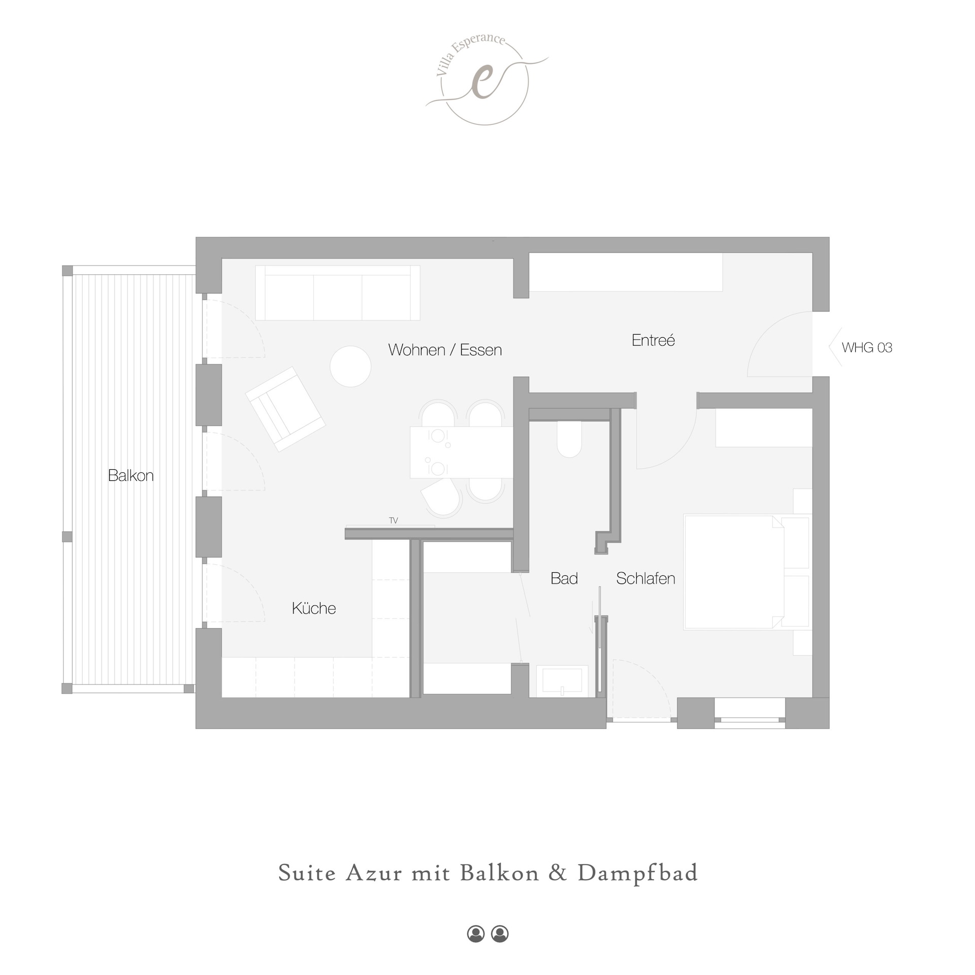 Die Suite Azur mit Balkon und Dampfbad befindet sich im Erdgeschoss und verfügt über geräumige ca. 64 m², über einen separaten Schlaf-/Wohnraum, eine offene Küchenzeile und ein Badezimmer mit Dampfbad. Der Balkon ist nach Westen gelegen. Die Küchenzeile ist ausgestattet mit einem Kühlschrank, Toaster und Ceran-Herdplatte, diese verfügt aber auch über Geschirr, Kochutensilien und Besteck. Für den morgendlichen Kaffee und Tee ist auf jeden Fall gesorgt, Sie können sich diese mit der vorhandenen Kaffeefiltermaschine und dem Wasserkocher zubereiten. Der gemütliche Wohnraum ist mit einem großen Flachbildfernseher mit Kabel-TV-Empfang ausgestattet, das WLAN steht Ihnen kostenlos zur Verfügung. Zu Ihrer Wohnung gehört auch ein Balkon, dieser ist mit Balkonmöbeln ausgestattet, wo Sie den Tag genießen können, aber auch abends ungestört den Tag ausklingen lassen können.