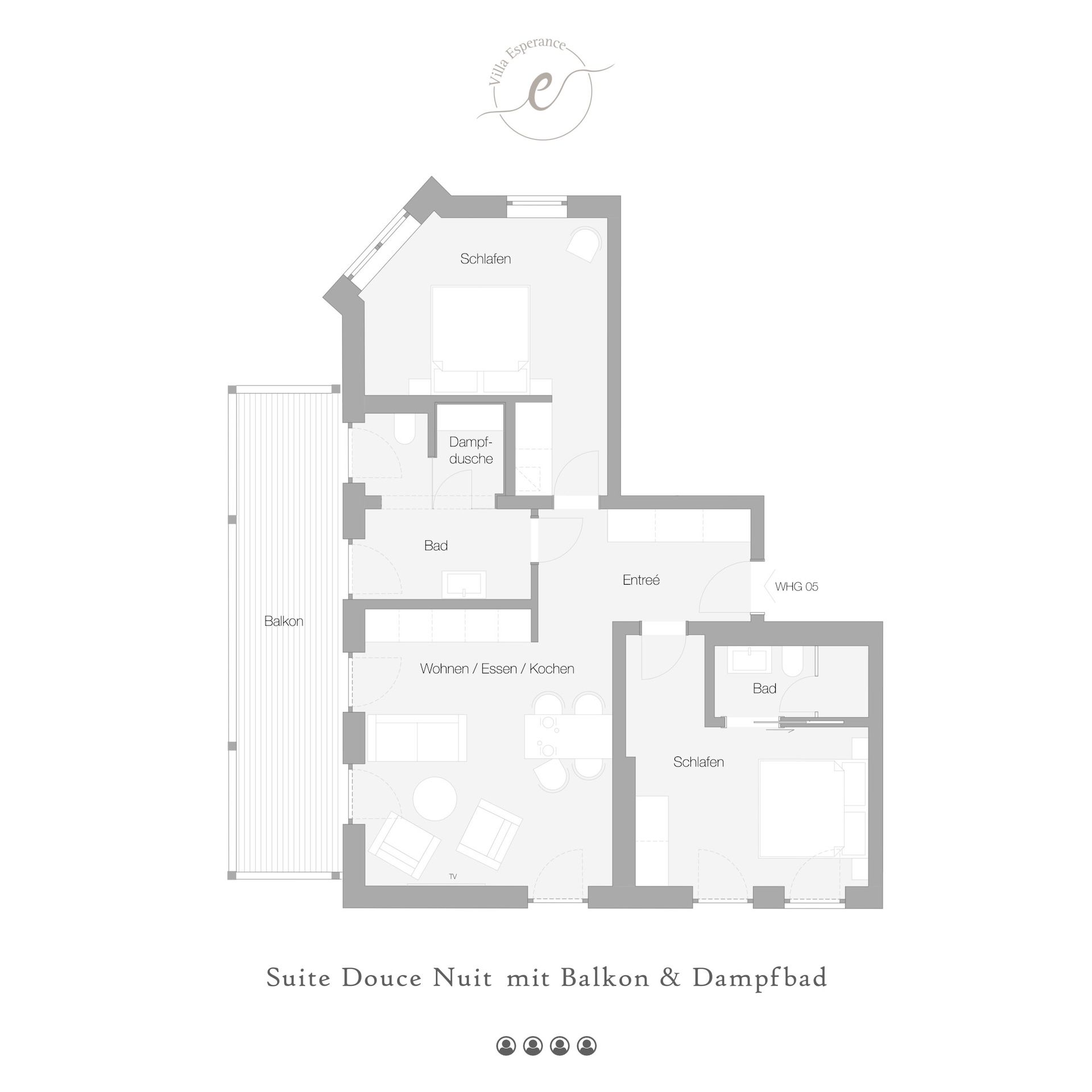 Die Suite Douce Nuit mit Balkon und Dampfbad befindet sich in der 1. Etage und verfügt über geräumige ca. 83 m², über 2 Schlafzimmer und einen separaten Wohnraum, einer offenen Küchenzeile sowie 2 Badezimmer und 1 Dampfbad. Die Küchenzeile ist ausgestattet mit einem Kühlschrank, Toaster und Ceran-Herdplatte, diese verfügt aber auch über Geschirr, Kochutensilien und Besteck. Für den morgendlichen Kaffee und Tee ist auf jeden Fall gesorgt, Sie können sich diese mit der vorhandenen Kaffeefiltermaschine und dem Wasserkocher zubereiten. Der gemütliche Wohnraum ist mit einem großen Flachbildfernseher mit Kabel-TV-Empfang ausgestattet, das WLAN steht Ihnen kostenlos zur Verfügung. Zu Ihrer Wohnung gehört auch ein Balkon, dieser ist mit Balkonmöbeln ausgestattet ist, wo Sie den Tag genießen können, aber auch abends ungestört den Tag ausklingen lassen können.