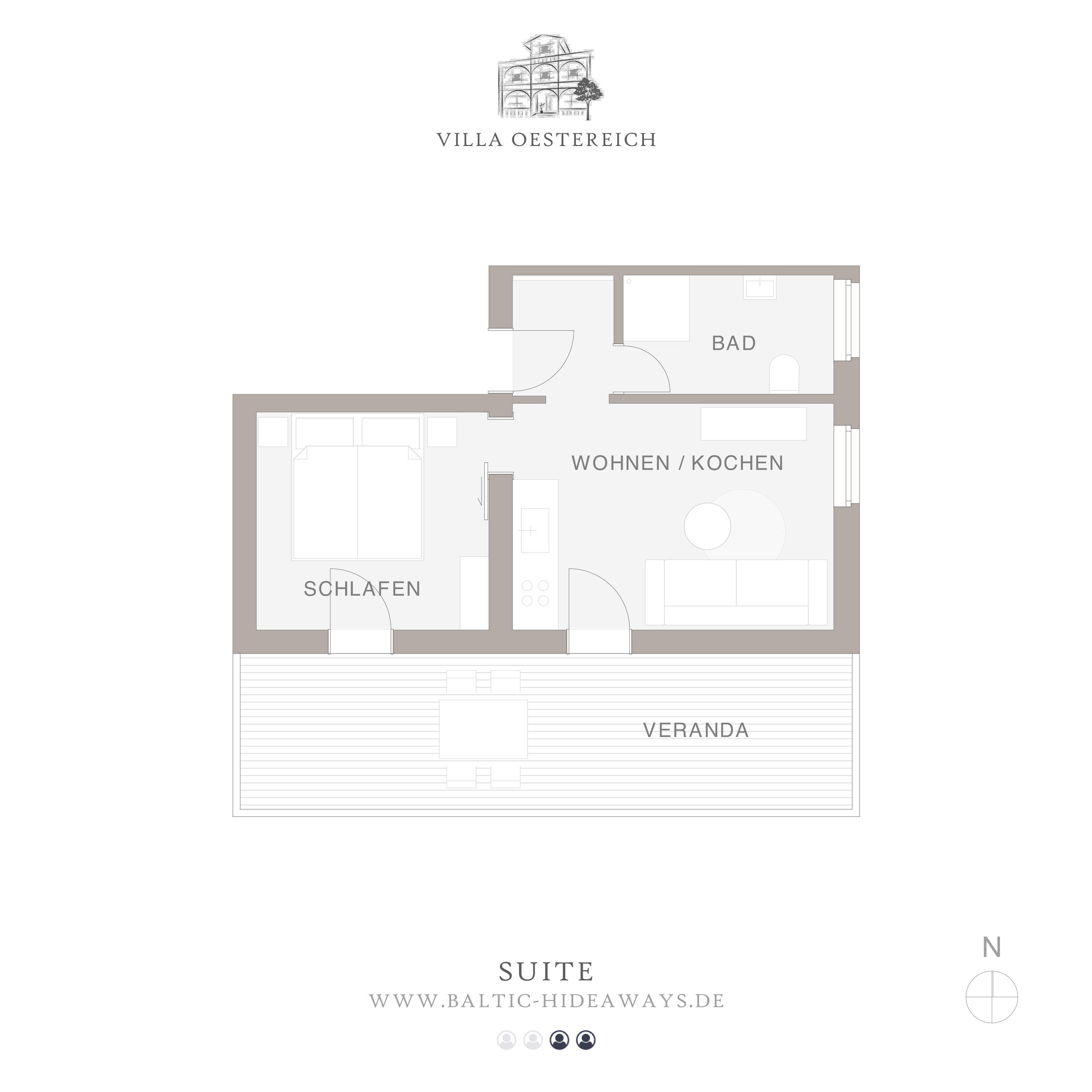 Unsere Suite befindet sich im 1. Obergeschoss und verfügt über 2 separate Zimmer, einem separaten Wohn- und einem Schlafraum. Die geschmackvoll ausgestattet und moderne Wohnung verfügt über 51,12 m². Die Ferienwohnung verfügt über eine voll ausgestattet Kochnische mit allem was man für den Urlaub braucht, Herd, Kühlschrank, Toaster sowie verfügt diese über Geschirr, Kochutensilien und Besteck. Für den morgendlichen Kaffee und Tee ist auf jeden Fall gesorgt, Sie können sich dieses mit der vorhandenen Kaffeemaschine (Nespresso-Kaffeemaschine sowie der Filterkaffeemaschine) und dem Wasserkocher zubereiten. Der gemütliche Essbereich befindet sich auf Ihrer Veranda und lädt zum gemeinsamen Essen sowie zusammensitzen ein. Das Doppelbett im Schlafzimmer verfügt über eine Größe von 180 × 200 cm. Das Wohnzimmer ist mit einem großen Flachbildfernseher mit Kabel-TV-Empfang und einem Radio ausgestattet, das WLAN steht Ihnen in der Wohnung kostenlos zur Verfügung.